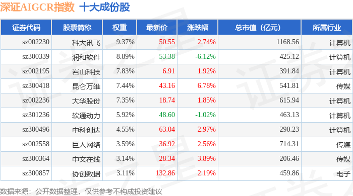 资金流向方面,深证AIGCR(470075)指数成份股当日主力资金净流出合计8885.58万元,游资资金净流出合计1.36亿元,散户资金净流入合计2.25亿元。成份股资金流向详情见下表: