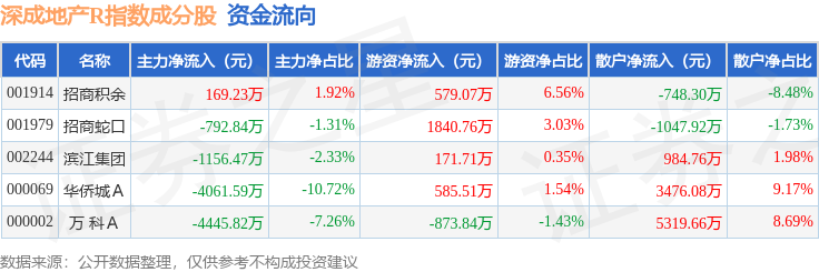 资金流向方面,深成地产R(471001)指数成份股当日主力资金净流出合计1.03亿元,游资资金净流入合计2303.21万元,散户资金净流入合计7984.28万元。成份股资金流向详情见下表: