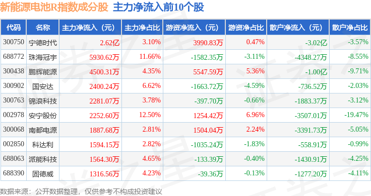 资金流向方面,新能源电池R(480027)指数成份股当日主力资金净流出合计3.78亿元,游资资金净流入合计6.06亿元,散户资金净流出合计2.28亿元。成份股资金流向详情见下表: