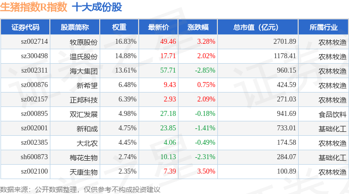 资金流向方面,生猪指数R(480073)指数成份股当日主力资金净流出合计1.11亿元,游资资金净流入合计327.98万元,散户资金净流入合计1.08亿元。成份股资金流向详情见下表: