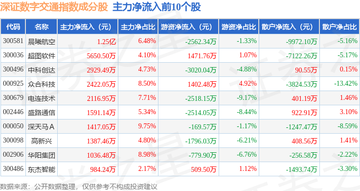 资金流向方面,深证数字交通(970049)指数成份股当日主力资金净流出合计1.3亿元,游资资金净流出合计2.95亿元,散户资金净流入合计4.25亿元。成份股资金流向详情见下表: