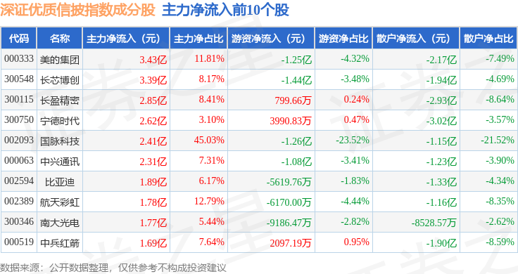 资金流向方面,深证优质信披(970065)指数成份股当日主力资金净流出合计33.75亿元,游资资金净流入合计7.05亿元,散户资金净流入合计26.7亿元。成份股资金流向详情见下表: