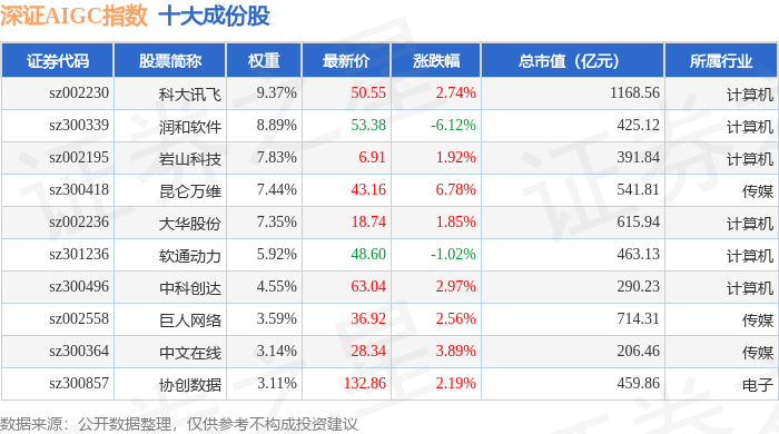 深证AIGC(970075)指数十大成份股详情如下: