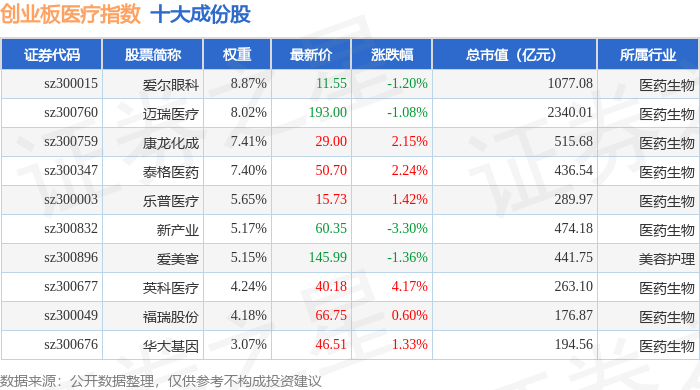 证券之星消息,11月24日,创业板医疗(970082)指数报收于3648.12点,涨0.86%,成交92.42亿元,换手率1.28%。当日该指数成份股中,上涨的有43家,中红医疗以6.08%的涨幅领涨,下跌的有6家,新产业以3.3%的跌幅领跌。