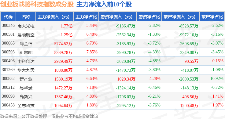 资金流向方面,创业板战略科技(971004)指数成份股当日主力资金净流出合计7.67亿元,游资资金净流出合计6720.5万元,散户资金净流入合计8.34亿元。成份股资金流向详情见下表: