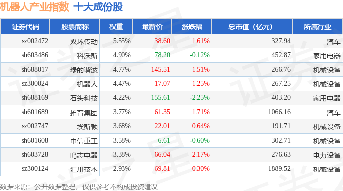 机器人产业(980022)指数十大成份股详情如下: