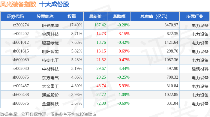 风光装备(980026)指数十大成份股详情如下:
