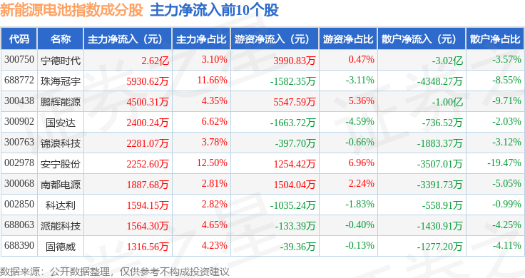 资金流向方面,新能源电池(980027)指数成份股当日主力资金净流出合计3.78亿元,游资资金净流入合计6.06亿元,散户资金净流出合计2.28亿元。成份股资金流向详情见下表: