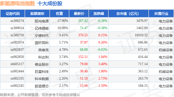 证券之星消息,11月24日,新能源电池(980027)指数报收于3191.36点,涨0.5%,成交420.5亿元,换手率1.82%。当日该指数成份股中,上涨的有36家,国安达以6.99%的涨幅领涨,下跌的有14家,科力远以2.03%的跌幅领跌。