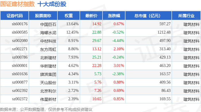 证券之星消息,11月24日,国证建材(980048)指数报收于4642.17点,涨0.09%,成交76.04亿元,换手率1.31%。当日该指数成份股中,上涨的有20家,四川双马以4.27%的涨幅领涨,下跌的有9家,中材科技以4.44%的跌幅领跌。