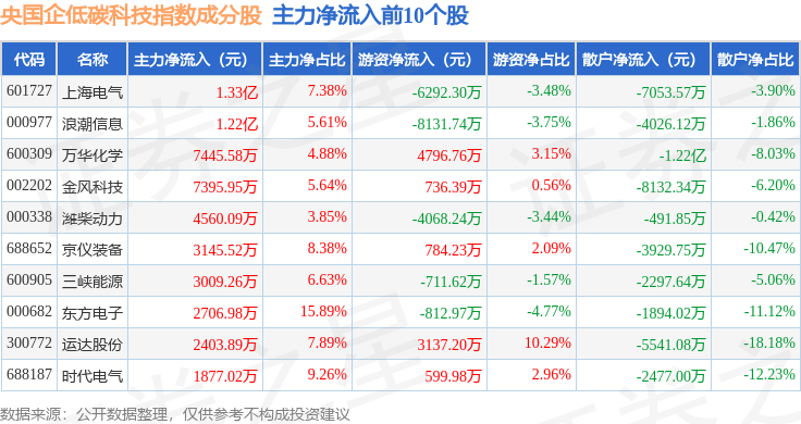 资金流向方面,央国企低碳科技(980082)指数成份股当日主力资金净流入合计7607.4万元,游资资金净流出合计2662.57万元,散户资金净流出合计4944.82万元。成份股资金流向详情见下表:
