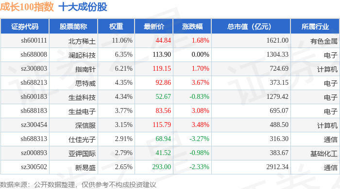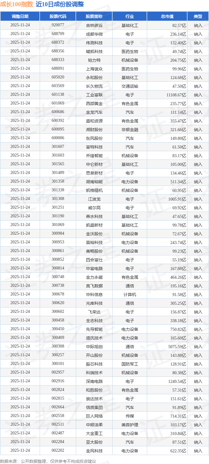 近10日内成长100(980080)指数成份股做了调整,新纳入了50只股票。