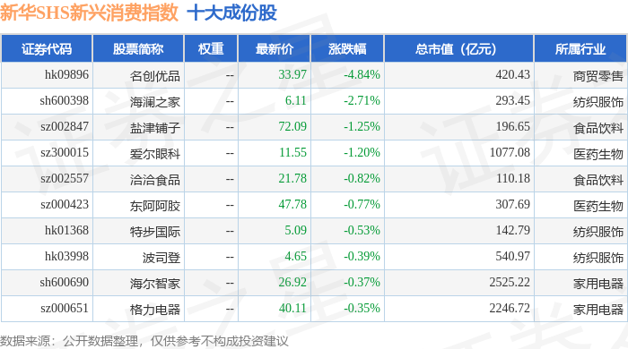 新华SHS新兴消费(989006)指数十大成份股详情如下: