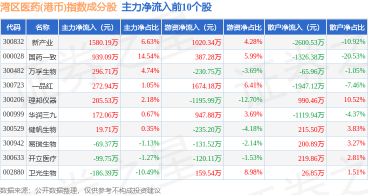 资金流向方面,湾区医药(港币)(980014)指数成份股当日主力资金净流出合计1.5亿元,游资资金净流出合计2143.51万元,散户资金净流入合计1.71亿元。成份股资金流向详情见下表: