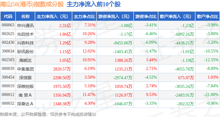 资金流向方面,南山50(港币)(980024)指数成份股当日主力资金净流出合计5.95亿元,游资资金净流出合计7986.6万元,散户资金净流入合计6.75亿元。成份股资金流向详情见下表: