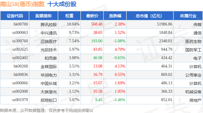 南山50(港币)(980024)指数十大成份股详情如下: