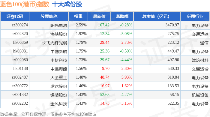 蓝色100(港币)(980069)指数十大成份股详情如下: