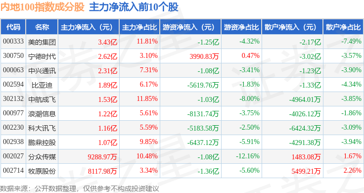 资金流向方面,内地100(983001)指数成份股当日主力资金净流出合计9.34亿元,游资资金净流入合计7.43亿元,散户资金净流入合计1.91亿元。成份股资金流向详情见下表: