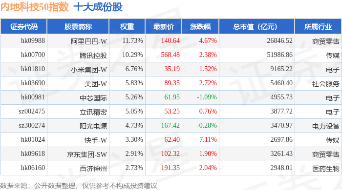 证券之星消息,11月24日,内地科技50(983003)指数报收于2926.5点,涨2.03%,成交1065.75亿元,换手率0.99%。当日该指数成份股中,上涨的有40家,北方华创以7.59%的涨幅领涨,下跌的有10家,新产业以3.3%的跌幅领跌。