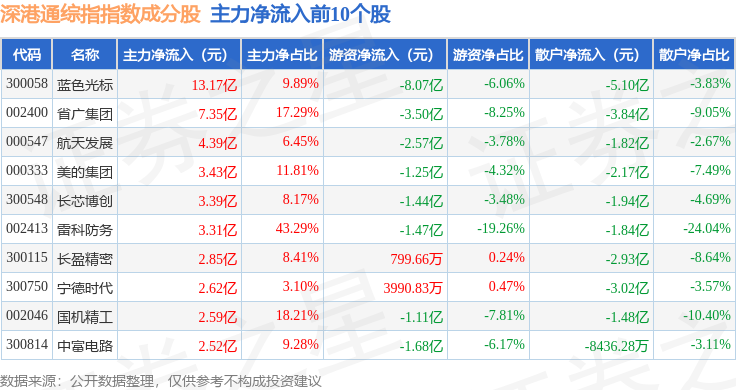 资金流向方面,深港通综指(983005)指数成份股当日主力资金净流出合计74.63亿元,游资资金净流出合计32.46亿元,散户资金净流入合计107.09亿元。成份股资金流向详情见下表: