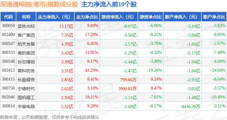 资金流向方面,深港通综指(港币)(983006)指数成份股当日主力资金净流出合计74.63亿元,游资资金净流出合计32.46亿元,散户资金净流入合计107.09亿元。成份股资金流向详情见下表: