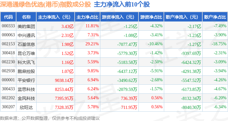 资金流向方面,深港通绿色优选(港币)(983012)指数成份股当日主力资金净流入合计12.38亿元,游资资金净流出合计5.6亿元,散户资金净流出合计6.79亿元。成份股资金流向详情见下表: