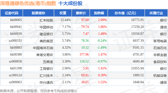 深港通绿色优选(港币)(983012)指数十大成份股详情如下: