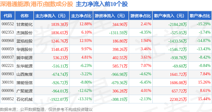 资金流向方面,深港通能源(港币)(983014)指数成份股当日主力资金净流出合计1.32亿元,游资资金净流入合计63.63万元,散户资金净流入合计1.31亿元。成份股资金流向详情见下表: