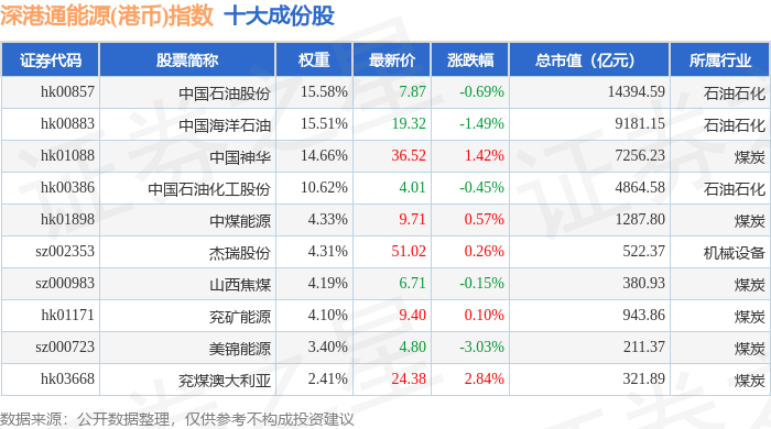 深港通能源(港币)(983014)指数十大成份股详情如下: