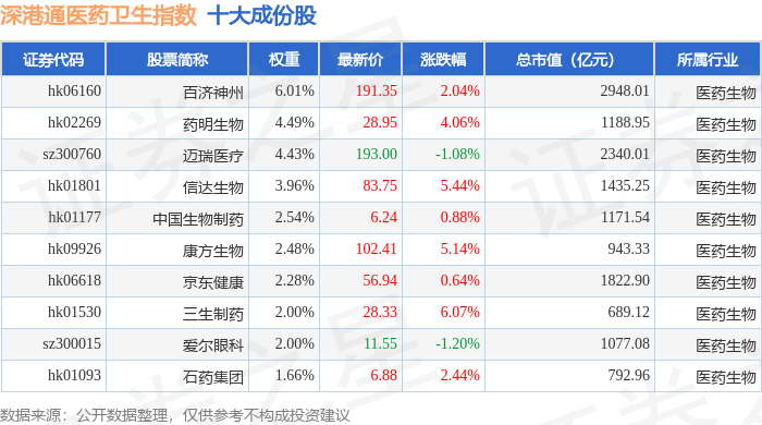 深港通医药卫生(983023)指数十大成份股详情如下: