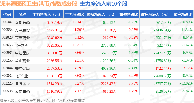 资金流向方面,深港通医药卫生(港币)(983024)指数成份股当日主力资金净流出合计10.34亿元,游资资金净流出合计1.01亿元,散户资金净流入合计11.35亿元。成份股资金流向详情见下表: