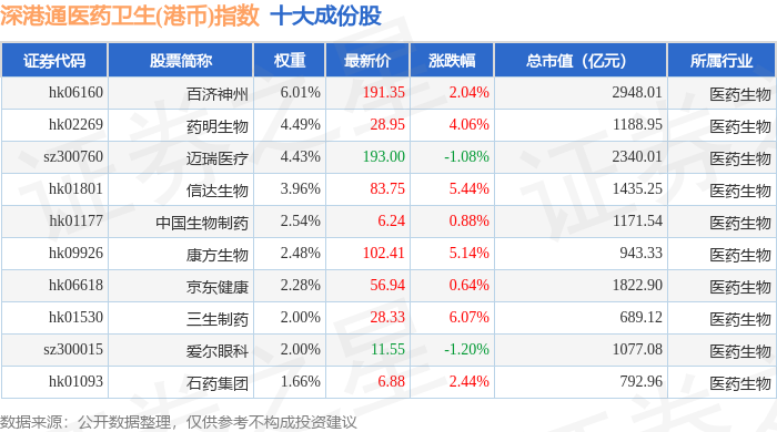 深港通医药卫生(港币)(983024)指数十大成份股详情如下: