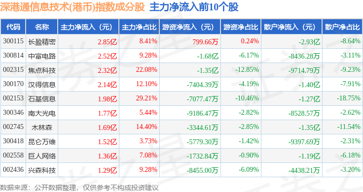 资金流向方面,深港通信息技术(港币)(983028)指数成份股当日主力资金净流出合计12.54亿元,游资资金净流出合计22.23亿元,散户资金净流入合计34.77亿元。成份股资金流向详情见下表: