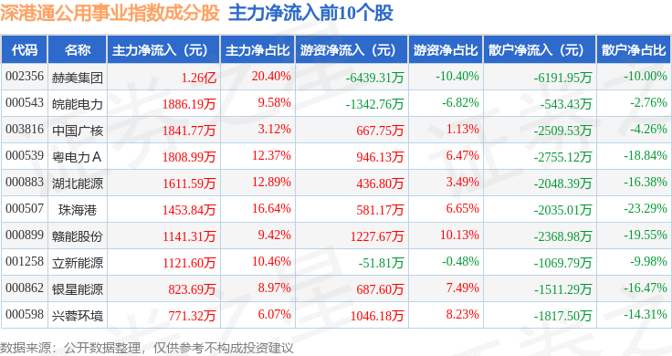 资金流向方面,深港通公用事业(983031)指数成份股当日主力资金净流入合计7466.98万元,游资资金净流入合计6008.21万元,散户资金净流出合计1.35亿元。成份股资金流向详情见下表: