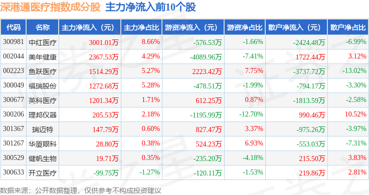 资金流向方面,深港通医疗(983035)指数成份股当日主力资金净流出合计4.72亿元,游资资金净流入合计4342.01万元,散户资金净流入合计4.29亿元。成份股资金流向详情见下表: