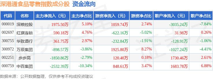 资金流向方面,深港通食品零售(983037)指数成份股当日主力资金净流出合计2354.39万元,游资资金净流入合计3099.55万元,散户资金净流出合计745.17万元。成份股资金流向详情见下表: