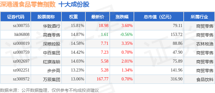 证券之星消息,11月24日,深港通食品零售(983037)指数报收于2337.47点,涨1.6%,成交17.89亿元,换手率1.72%。当日该指数成份股中,上涨的有6家,华致酒行以3.6%的涨幅领涨,下跌的有1家,高鑫零售以0.56%的跌幅领跌。