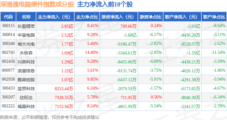 资金流向方面,深港通电脑硬件(983043)指数成份股当日主力资金净流出合计8.28亿元,游资资金净流出合计10.23亿元,散户资金净流入合计18.51亿元。成份股资金流向详情见下表: