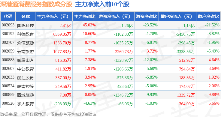 资金流向方面,深港通消费服务(983045)指数成份股当日主力资金净流入合计2.09亿元,游资资金净流出合计1.81亿元,散户资金净流出合计2855.56万元。成份股资金流向详情见下表: