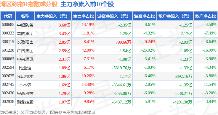 资金流向方面,湾区综指R(480003)指数成份股当日主力资金净流出合计30.75亿元,游资资金净流出合计2495.89万元,散户资金净流入合计30.97亿元。成份股资金流向详情见下表: