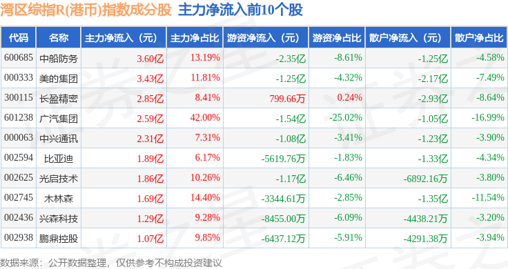 资金流向方面,湾区综指R(港币)(480004)指数成份股当日主力资金净流出合计30.75亿元,游资资金净流出合计2495.89万元,散户资金净流入合计30.97亿元。成份股资金流向详情见下表: