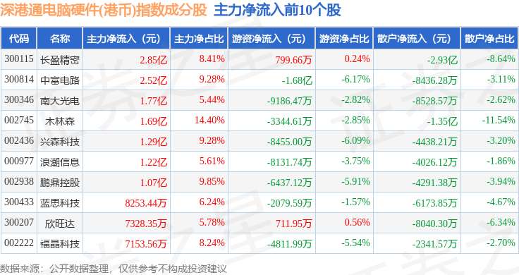 资金流向方面,深港通电脑硬件(港币)(983044)指数成份股当日主力资金净流出合计8.28亿元,游资资金净流出合计10.23亿元,散户资金净流入合计18.51亿元。成份股资金流向详情见下表: