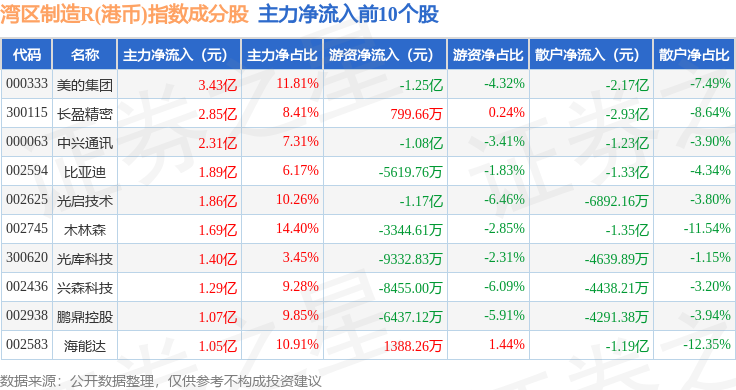 资金流向方面,湾区制造R(港币)(480010)指数成份股当日主力资金净流入合计5835.7万元,游资资金净流出合计2.28亿元,散户资金净流入合计1.7亿元。成份股资金流向详情见下表: