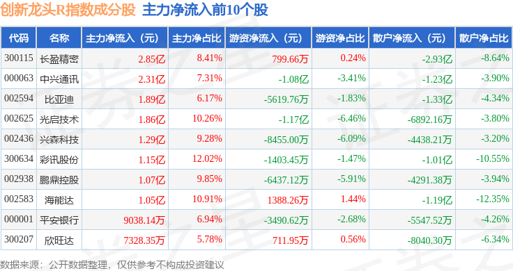 资金流向方面,创新龙头R(480036)指数成份股当日主力资金净流出合计3.6亿元,游资资金净流出合计9688.8万元,散户资金净流入合计4.57亿元。成份股资金流向详情见下表: