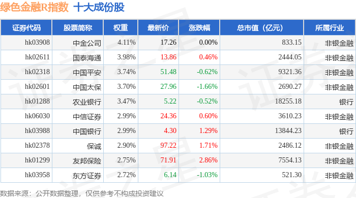 资金流向方面,绿色金融R(480052)指数成份股当日主力资金净流出合计3.41亿元,游资资金净流入合计1627.14万元,散户资金净流入合计3.25亿元。成份股资金流向详情见下表: