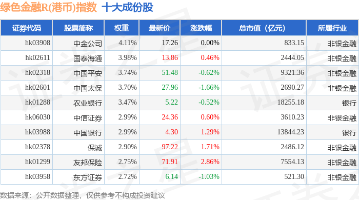 绿色金融R(港币)(480053)指数十大成份股详情如下: