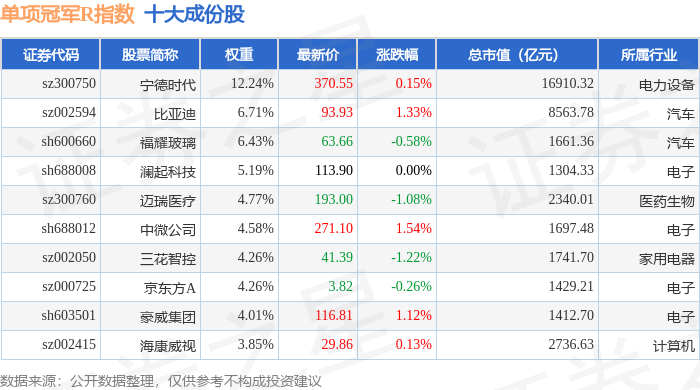 证券之星消息,11月24日,单项冠军R(480150)指数报收于9809.0点,涨0.3%,成交780.86亿元,换手率1.3%。当日该指数成份股中,上涨的有27家,中航成飞以4.26%的涨幅领涨,下跌的有21家,天赐材料以3.53%的跌幅领跌。
