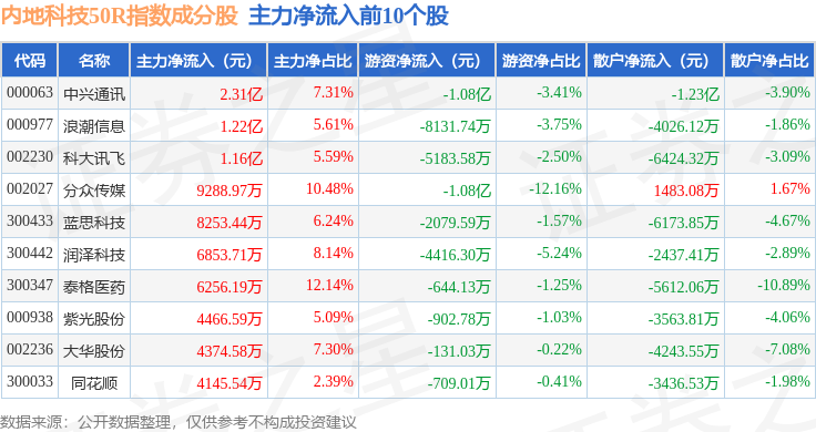 资金流向方面,内地科技50R(483003)指数成份股当日主力资金净流入合计4.56亿元,游资资金净流出合计1.69亿元,散户资金净流出合计2.86亿元。成份股资金流向详情见下表: