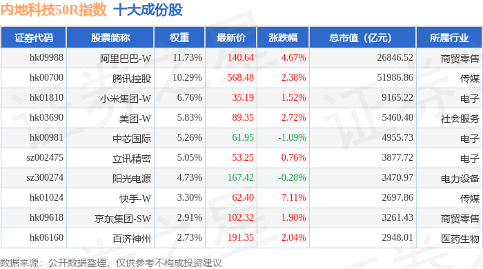 证券之星消息,11月24日,内地科技50R(483003)指数报收于3274.22点,涨2.03%,成交1065.75亿元,换手率0.99%。当日该指数成份股中,上涨的有40家,北方华创以7.59%的涨幅领涨,下跌的有10家,新产业以3.3%的跌幅领跌。