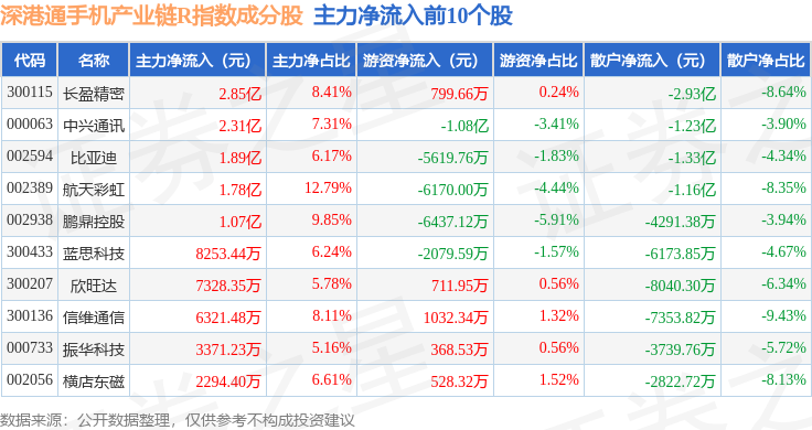 资金流向方面,深港通手机产业链R(483009)指数成份股当日主力资金净流入合计2.01亿元,游资资金净流出合计3.82亿元,散户资金净流入合计1.82亿元。成份股资金流向详情见下表:
